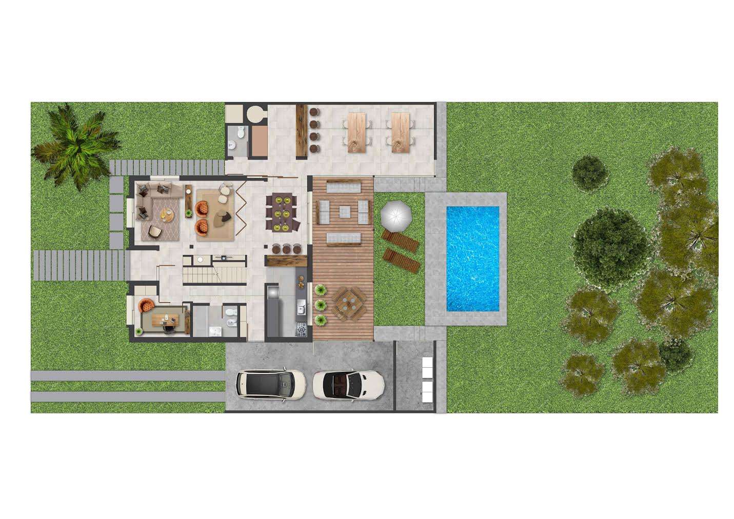 La obra consistió en la reforma de una casa de dos plantas existente, complementada con la incorporación de dos nuevas alas: una destinada a servicio y garage, y otra a barbacoa, equilibrando espacios de uso cotidiano y áreas de recreación. La intervención incluyó además amplias zonas de ocio y una piscina en el fondo, logrando un resultado que combina elegancia, confort y exclusividad, haciendo de esta vivienda un ejemplo único de diseño residencial adaptado a las necesidades y estilo de vida de sus propietarios.